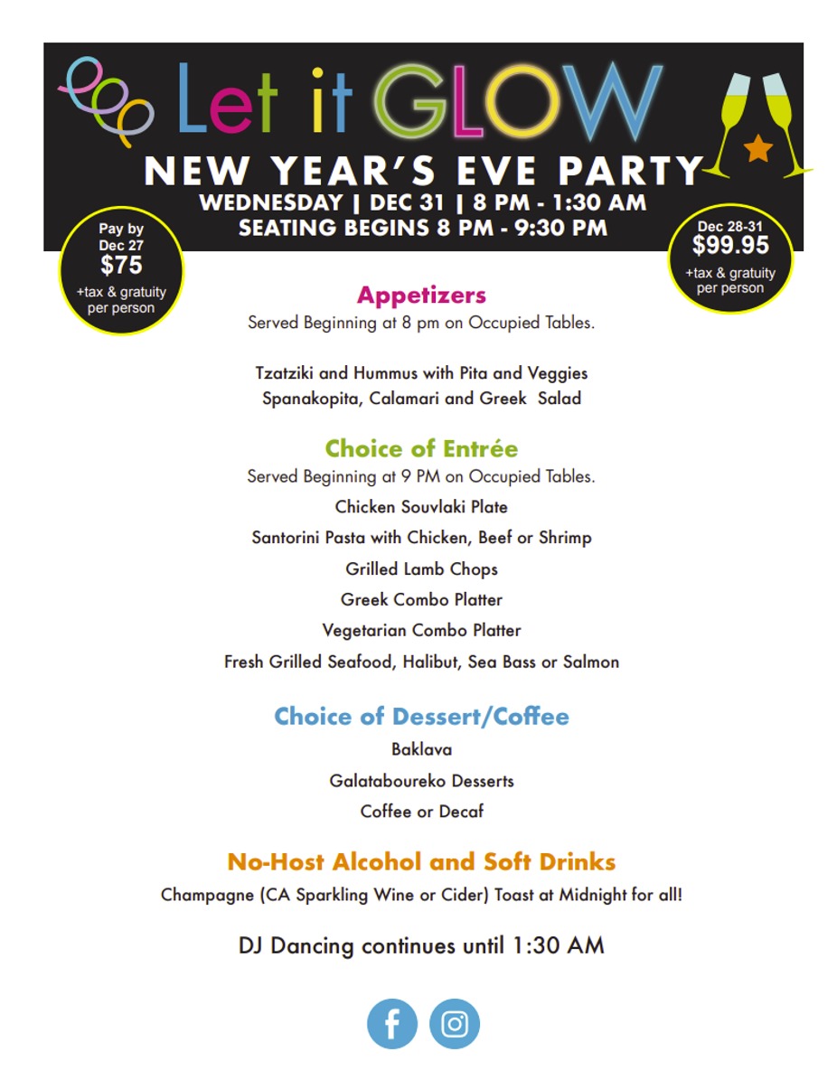Christmas Eve: hours 11am-8 pm. Belly Dance Show at 6:30 pm (Reg Menus) Christmas day: Hours Noon-5 pm Dinner Menu only. No Entertainment.Make your reservation today and celebrate the holidays in style at The Greek Mediterranean Steak & Seafood!
